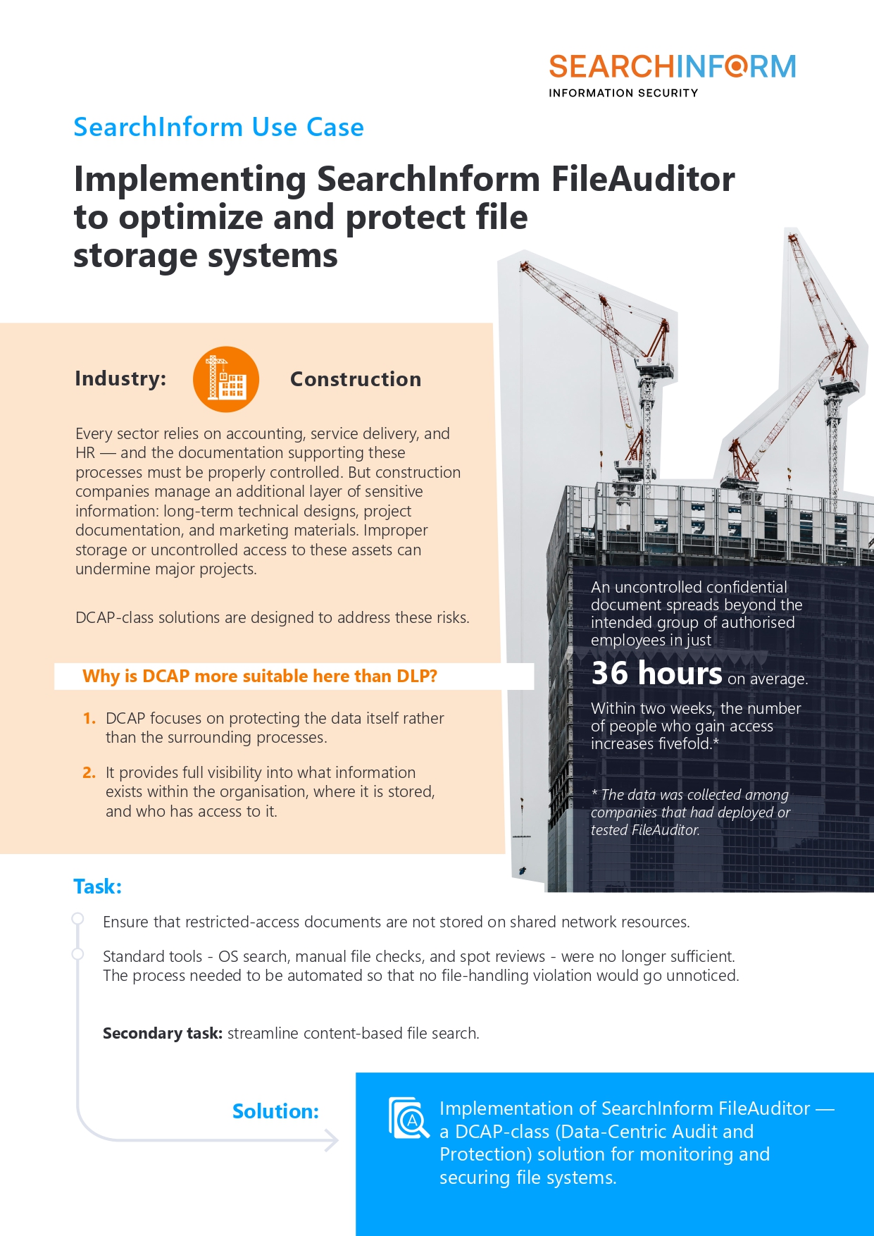 Learn how a major construction company automated file-storage control, eliminated unauthorized data placement, and gained full visibility over sensitive content using DCAP system, SearchInform FileAuditor (DCAP.